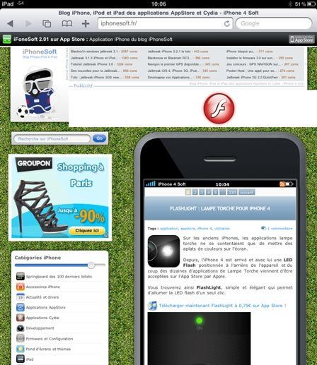 En tout cas aucun contenu flash ne peut être lu sur les tests effectués et on peut juste voir les logo Flash apparaître en lieu et place d'animation Flash. (voir notre capture iPad en dessous)