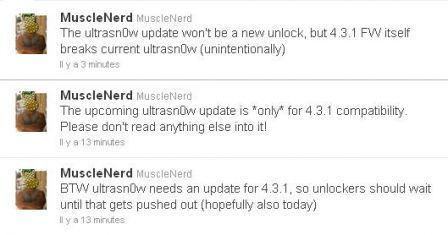 Suite à trois tweets d'il y a une dizaine de minutes, la nouvelle version d'Ultrasn0w ne sera utilisable que pour le jailbreak de l'iOS 4.3.1.