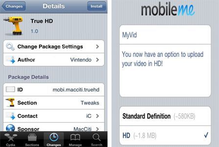 True HD est un nouveau tweak développé par Vintendo, disponible sur Cydia, et qui vous permet d'uploader vos vidéos en Haute Définition avec votre   iPhone 4 sur MobileMe ou bien  sur Youtube.