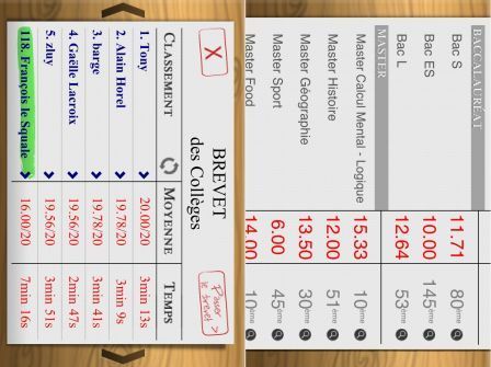 Présenté sous forme de QCM, iDiplôme vous questionnera sur les sujets d'examen selon votre niveau. Les questions sont répertoriées en catégories (histoire, géographie, mathématiques...) et un coefficient est appliqué à chacune des matières selon le diplôme que vous "passez".