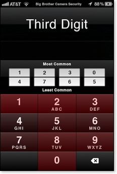 Big Brother Camera Security (VF, 5.9 Mo) qui présente les codes à 4 chiffres les plus utilisés pour déverrouiller son application.