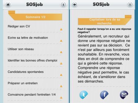 Une interface originale, de nombreux conseils, SOS Job est le parfait conseiller en recrutement. Vous apprendrez des choses telles que :Comment se comporter avec plusieurs interlocuteurs ? ou encore Quel est le meilleur moment pour évoquer la question de la rémunération ? bref autant de conseils qu'il est bon de connaitre pour assurer un bon entretien.