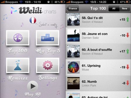 C'est tout simplement un classement des 100 musiques les plus écoutées dans 22 pays avec une pré écoute ! Mais ceci est loin d'être l'unique utilité à cette application ! Voyons ensemble ce qui fait que Welili se démarque plus que largement des autres applications du genre :