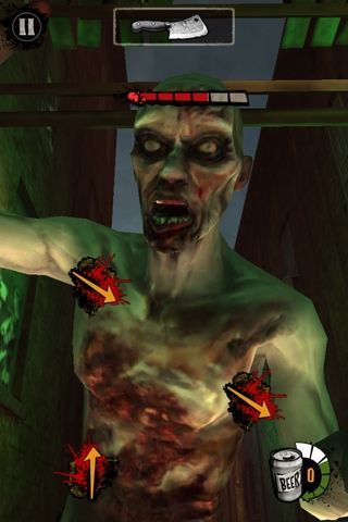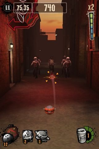 Vous voilà donc armé de vos boules ... de bowling. Je vous l'annonce tout de suite, il y a beaucoup de jeux de mots plus ou moins salaces autour des "boules" du personnage. Vous voilà prévenu ! Bref, celles-ci en tout cas vont vous permettre de dégommer des hordes de zombies qui vont venir vers vous dans le but évident de vous grignoter. A vous donc de les détruire tant qu'ils sont loin. Mais rassurez-vous, vous possédez également une arme de poing afin de tuer ceux qui s'approcheraient trop près. Cela donne l'occasion d'un mini-jeu où vous devrez glisser sur l'écran pour taillader la vilaine créature.