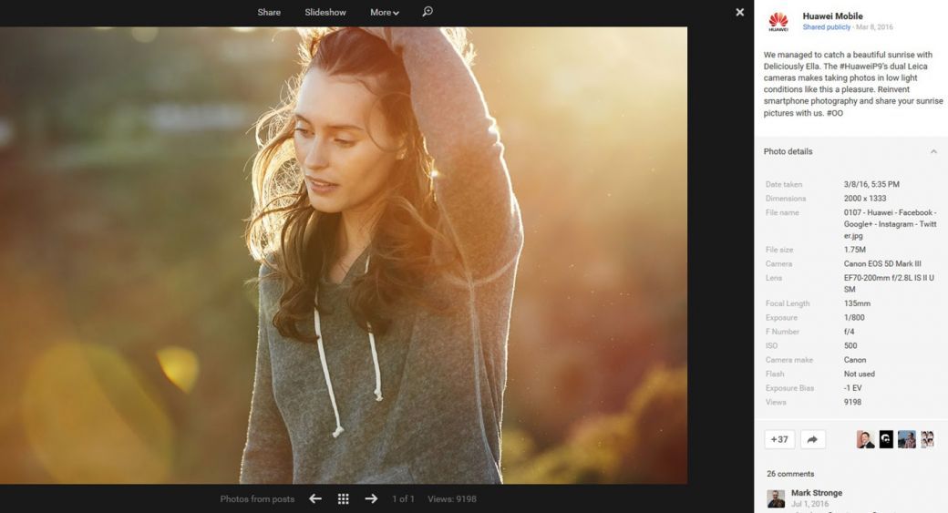Huawei n'a rien trouvé de mieux qu'une photographie prise par un appareil reflex 5D Mark III pour mettre en avant son tout nouveau smartphone équipé d'un double objectif Leica, le P9. On pourrait ainsi penser que Huawei n'a pas assez confiance en cette nouvelle technologie pour utiliser des images réalisées avec le P9 dans la promotion de l'appareil...