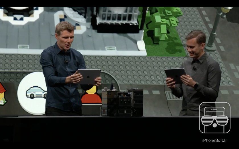 | 19h26 | La démo de la reconnaissance des objets 3D d'ARKIT 2 est impressionnante : de nombreux détails virtuels viennent s'ajouter au modèle physique de LEGO |