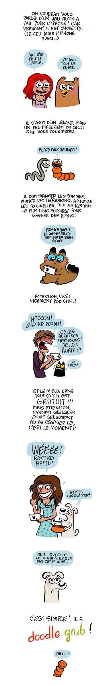 Je vais répondre à cette interview pour tous les deux et de ce pas commencer en vous présentant Laurel: Laurel est dessinatrice de bandes dessinées, elle est connue pour son blog qu'elle met à jour quotidiennement depuis de nombreuses années (www.bloglaurel.com). Elle est également l'auteur de différents albums aux éditions Glénat, Dargaud, Warum, et Le Lombard (bientôt). Vous pourrez la retrouver aussi dans le magasine Spirou. :) C'est donc en toute logique qu'elle a travaillé sur les graphismes de Doodle Grub. Pour ma part, je suis développeur iPhone/iPad indépendant depuis juin 2010, date à laquelle j'ai terminé mes études à Gobelins. J'ai développé différents types d'applications mais j'avoue avoir une grosse préférence pour les jeux.